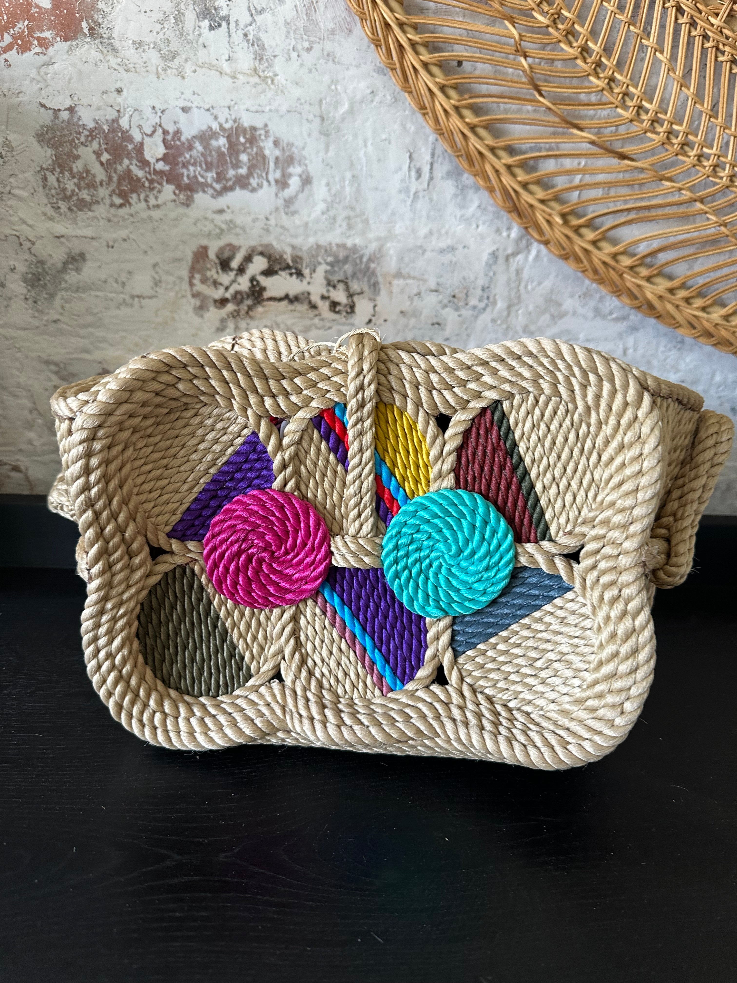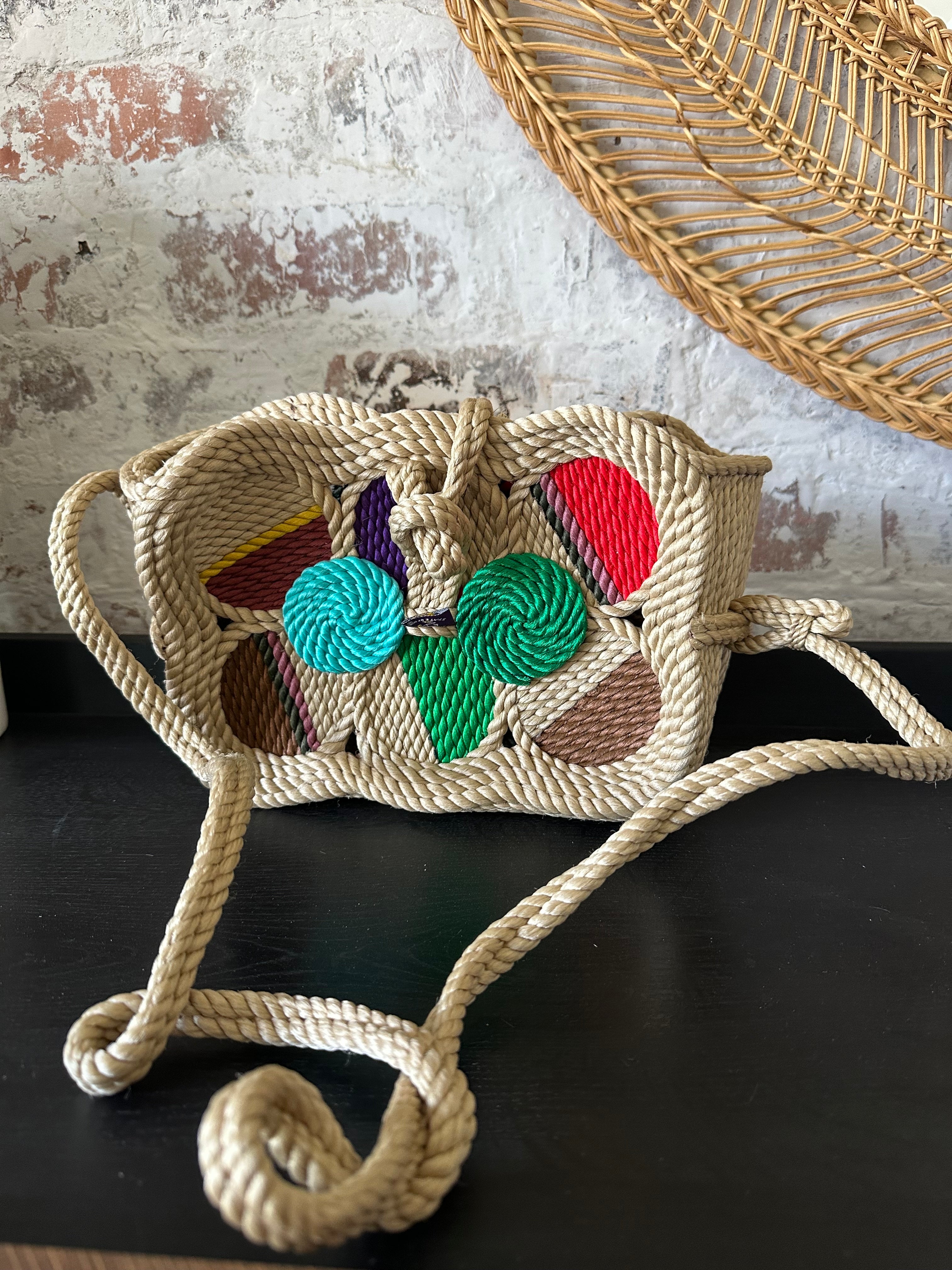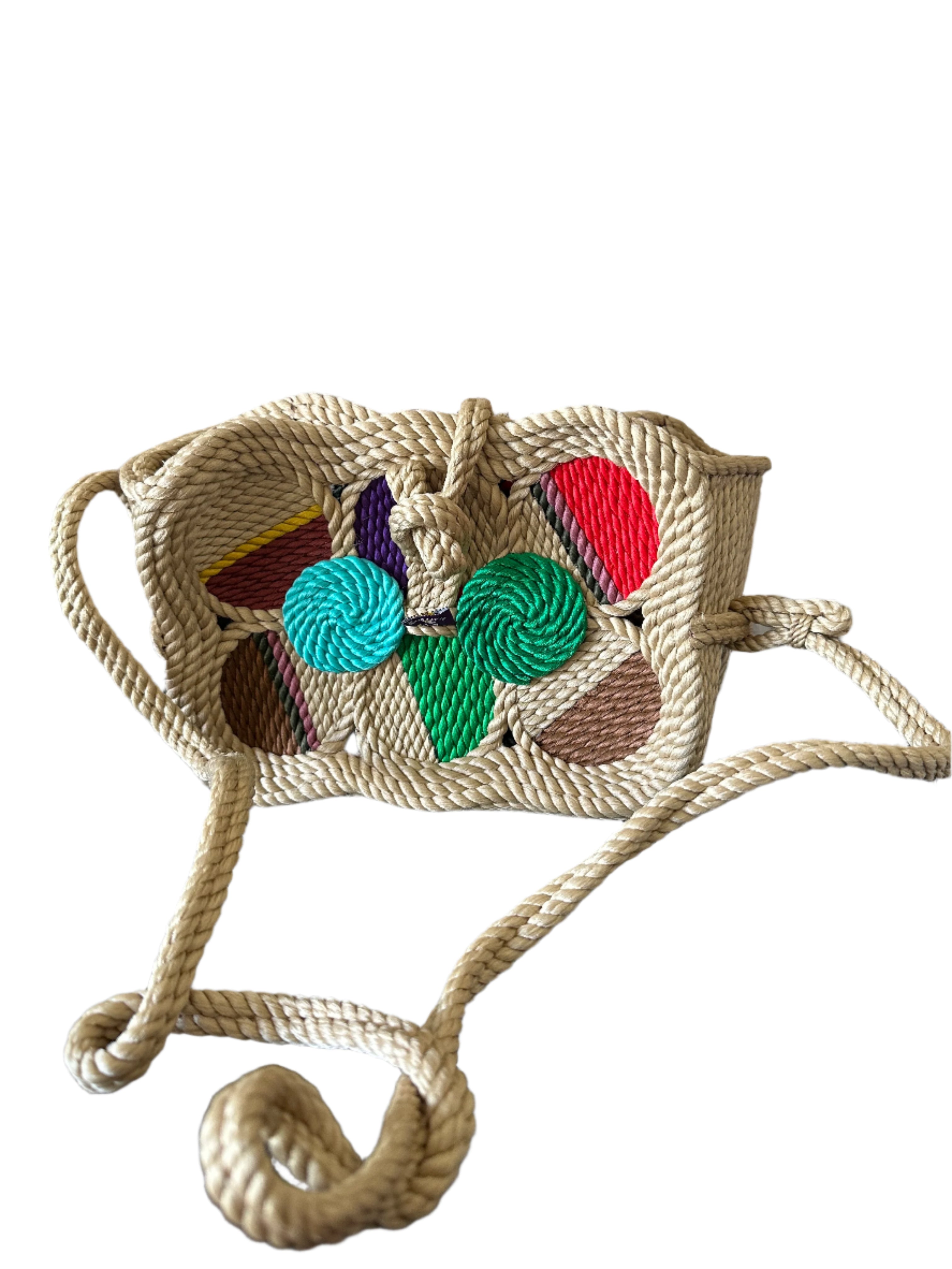 Designed with intention and full of character, the Small Colored Circles Bag is handcrafted from leftover rope scraps from our sandal production — turning waste into wearable art. Each piece is zero-waste, eco-conscious, and completely one-of-a-kind, with colors and textures that vary based on the materials available.